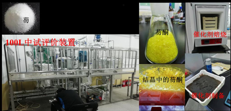 近日,依托河南省催化反应工程研究中心,受山西博荟源化工科技有限公司委托开发的芴一步氧化法制备芴酮技术,于2021626日在山西太原一次性投料中试开车成功。该技术以空气为氧化剂,借助Cu基催化剂在100~160℃,1.0~1.6 MPa的温和条件下,实现了芴转化率>99%,芴酮收率>98.5%的目标。初级产物经蒸馏、重结晶后,芴酮纯度提高至99.5%以上。这标志着芴液相氧化制备芴酮放大过程中存在的多项关键技术瓶颈已被攻克,具备了大规模推广应用的可行性。