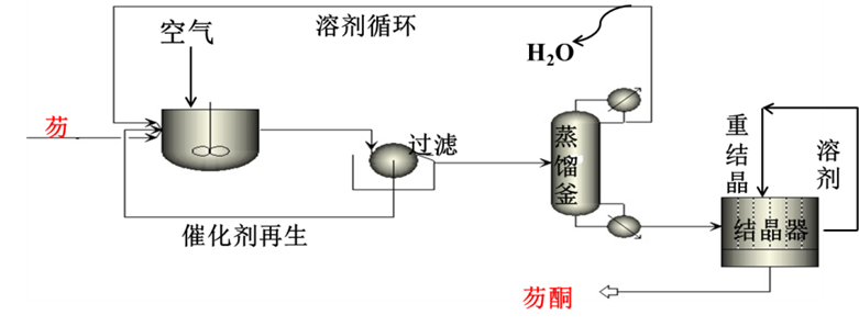 目前,固定床反应器上芴高温气相氧化制备芴酮过程,存在芴易被过度氧化,副产物多且催化剂寿命低等难题。而传统液相氧化法制备芴酮需要在碱性条件下,借助相转移催化剂才能实现芴的高效转化,但该过程增加了产物后期分离、提纯的难度,同时存在均相催化剂分离、回收困难等难题。