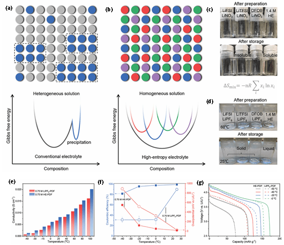 硝酸锂(LiNO3)能形成富含Li3N的高导离子SEI,但其在碳酸酯电解质中溶解度极低。高熵电解质:图11a-b阐释多盐混合降低凝固点的机制,其离子电导率在-40 ℃仍保持5.8 mS cm-1,全电池容量保持率达99%。