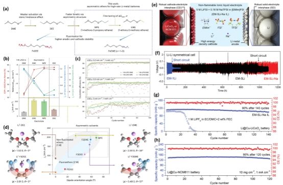 设计了一种不对称醚溶剂(如MPE和EME),其分子结构显著降低粘度并提升离子电导率。通过分子动力学模拟,该溶剂削弱了Li⁺-溶剂相互作用,使交换电流密度提升50%以上,实现了-30℃下稳定循环。
