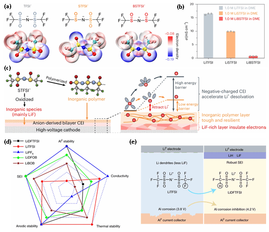 通过对比LiTFSI、LiSTFSI等锂盐的静电势与离子电导率,发现小体积阴离子(如STFSI⁻)可促进盐解离,并生成富含LiF的CEI层。雷达图显示LiDFTFSI在稳定性与电导率间取得最佳平衡。
