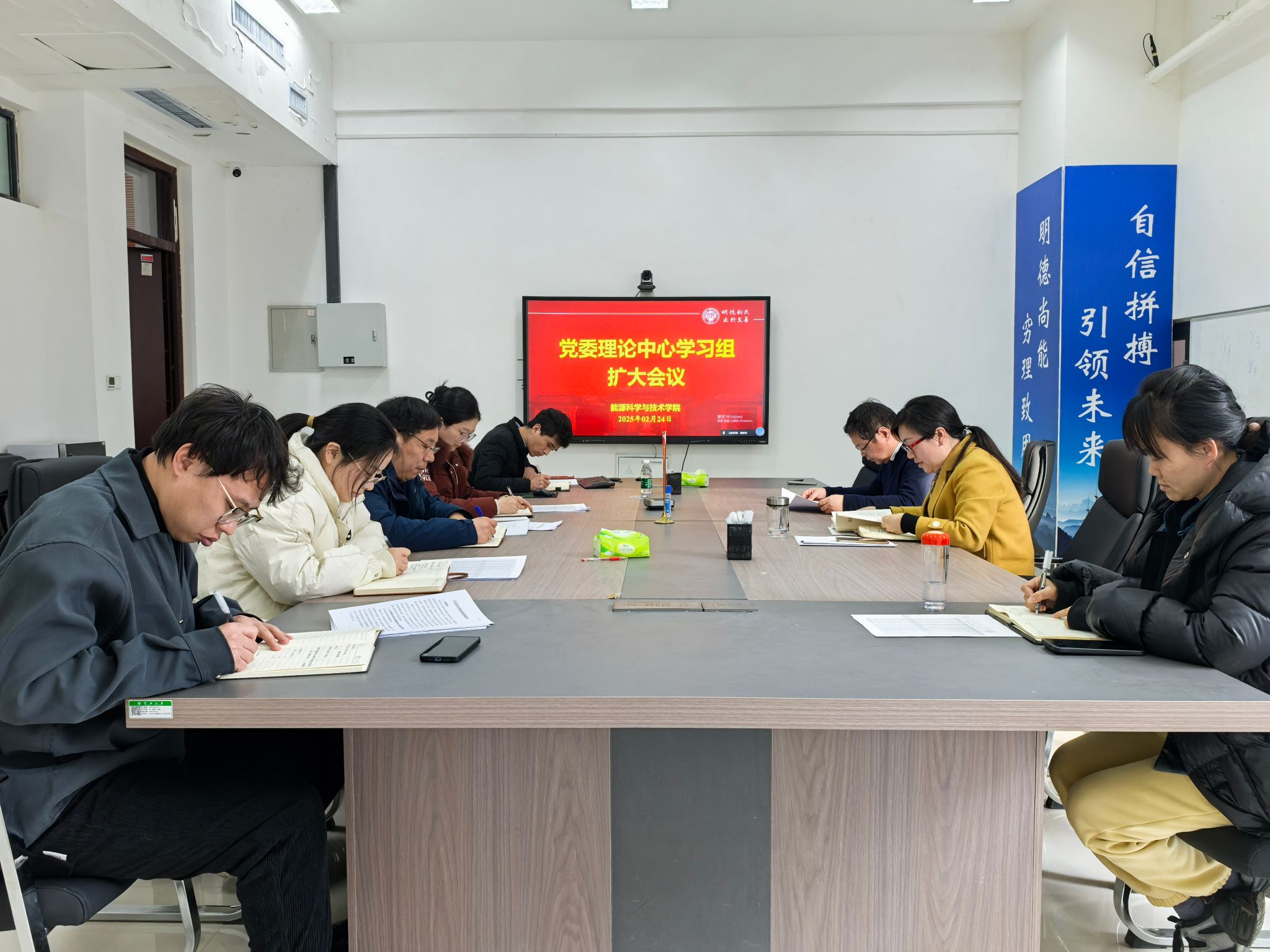 在九章学堂北楼A203会议室召开党委理论学习中心组(扩大)学习会议,学院领导班子成员、各党支部书记、各系主任参加会议。会议由院党委书记程亚敏主持。