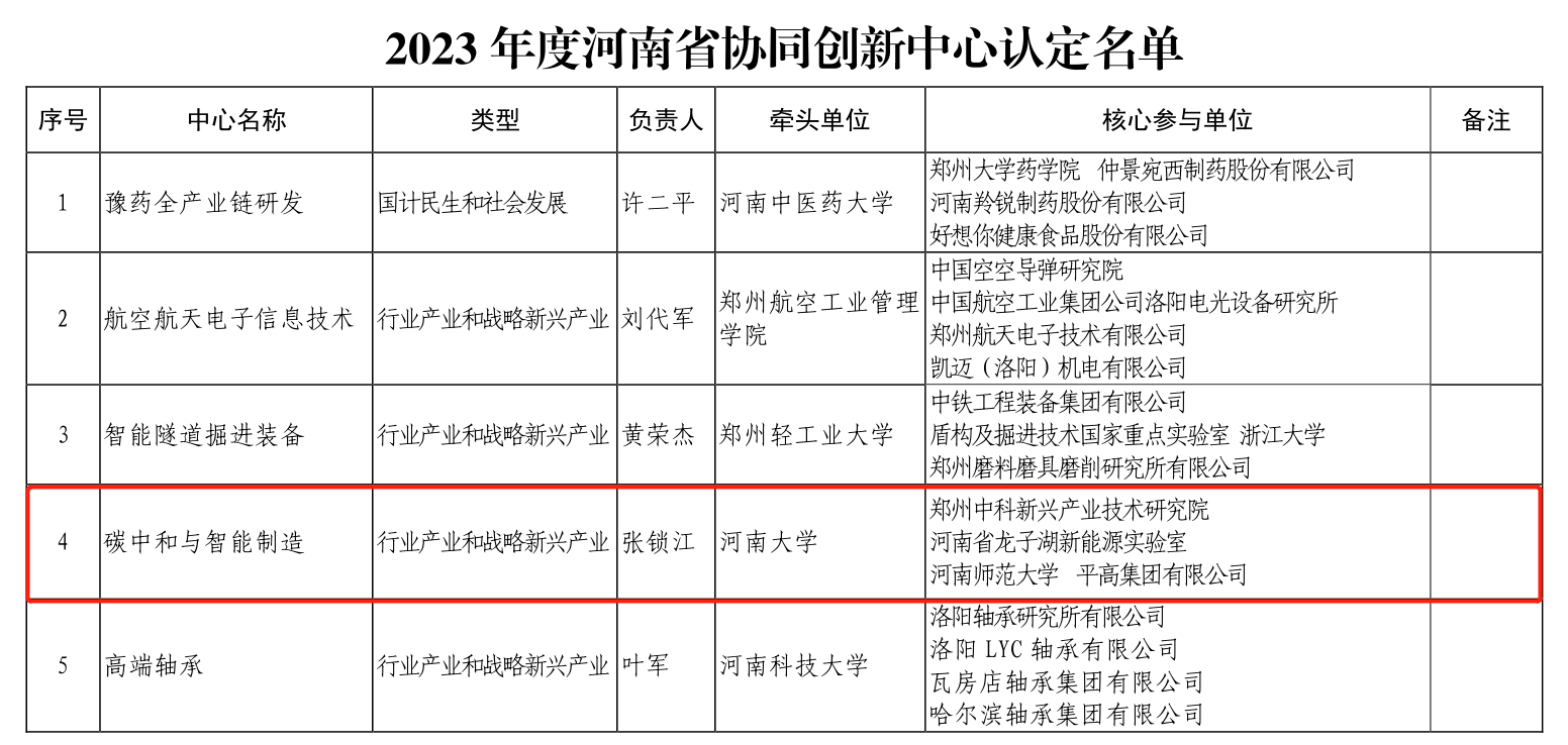 近日,河南省教育厅公布了2023年度河南省协同创新中心认定结果,由我校牵头,联合郑州中科新兴产业技术研究院、河南省龙子湖新能源实验室、河南师范大学、平高集团有限公司等单位组建的“碳中和与智能制造协同创新中心”成功入选,中心主任为张锁江院士。