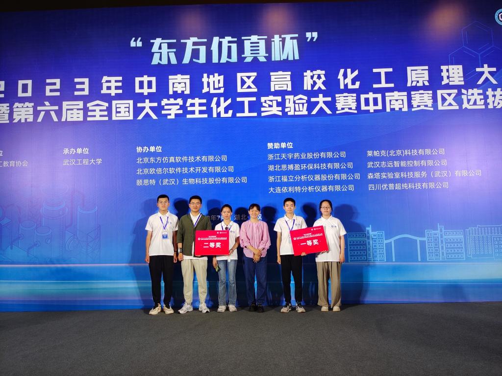 2023年7月10日-13日,“东方仿真杯”2023年中南地区高校化工原理大赛暨第六届全国大学生化工实验大赛中南赛区选拔赛,由中国化工教育协会主办,武汉工程大学承办。本届赛事中南地区(河南、湖北、湖南、福建、广东、海南)共有127支队伍参赛。比赛内容包括化工原理理论(占比40%)、化工单元仿真操作(占比20%)和化工原理实验(占比40%)三部分内容。学生刘友方、孙泽云、丁恒吉、胡康、杨润良和唐浩博组成的两支参赛队伍,在学院教师的精心指导下,赛出了风格和水平,荣获中南赛区一等奖一项和二等奖一项。