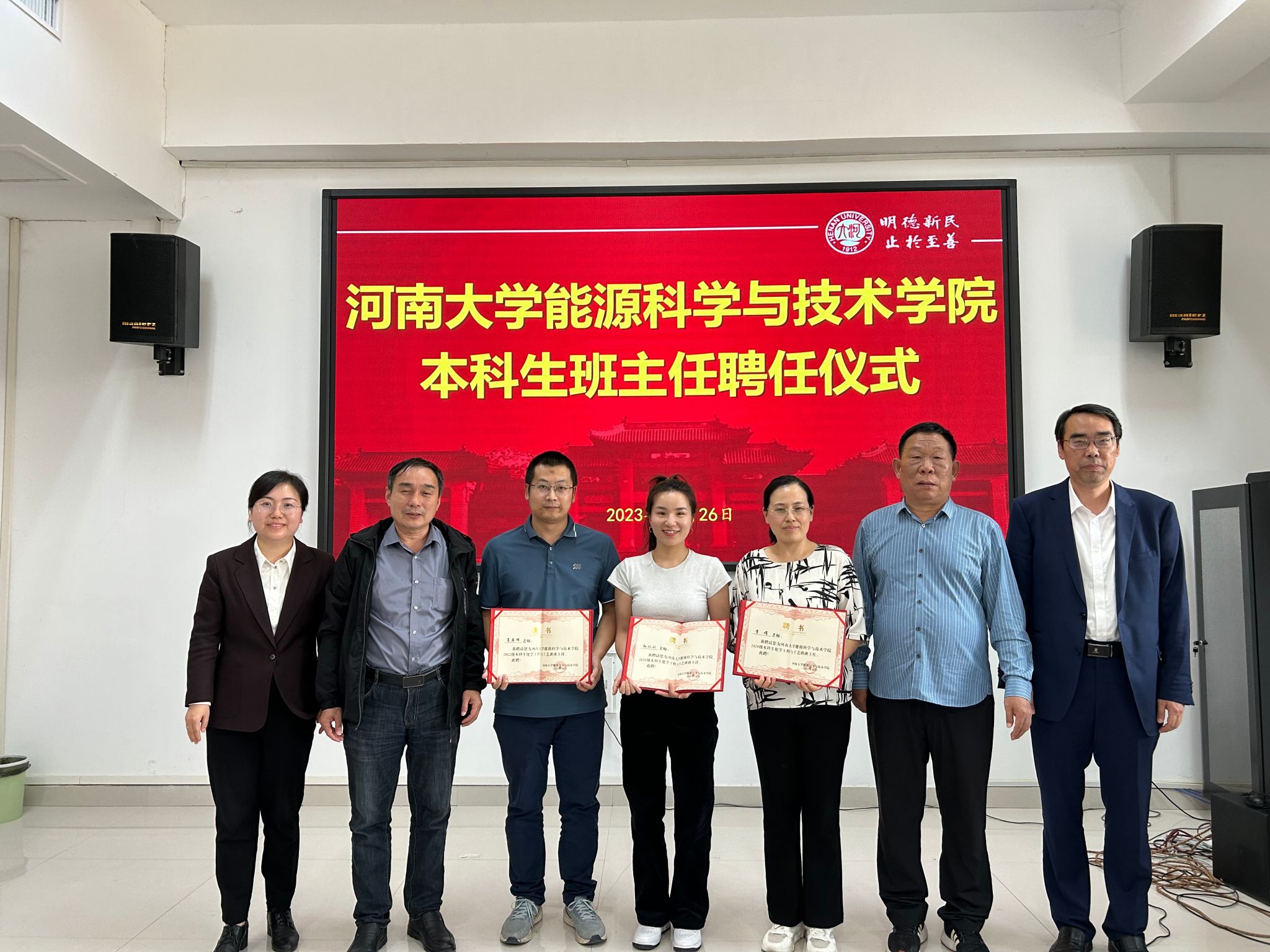 程亚敏介绍了学院为本科生配备班主任的意义、班主任的岗位职责和工作要求、选聘与配备、管理与考核等。按照学院的相关要求,经过老师们的个人自荐和学院遴选,聘任李娟、肖亚辉、孙认认和曹莹莹等四位教师为本科生班主任。乔聪震、马新起、郭泉辉等老教师代表为班主任颁发聘任证书并合影留念。