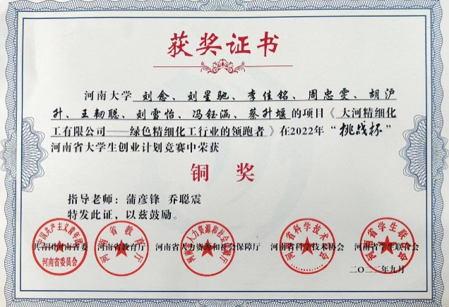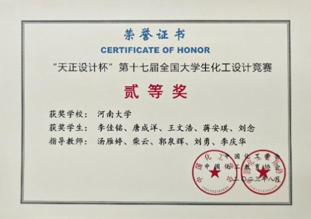 在学科竞赛的道路上,李佳铭也收获满满。在“天正设计杯”第十七届全国大学生化工设计竞赛中,李佳铭担任队伍队长,面对困难,他努力克服,对于作品,他精益求精,最终获得全国二等奖。此外,李佳铭以核心成员身份参与并荣获第九届中国国际“互联网+”大学生创新创业大赛省级一等奖、第十六届“挑战杯”河南省大学生课外学术科技作品竞赛省级一等奖、2022年“挑战杯”河南省大学生创业计划竞赛省级铜奖。