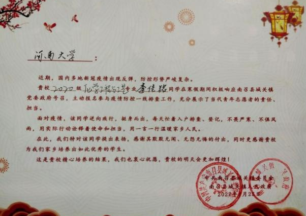 在课余时间,他积极报名参加重阳节敬老院献爱心、黄河滩植树等多项志愿服务活动。他行而不辍,履践致远,在青春的赛道上奋力奔跑,让青春在全面建设社会主义现代化国家的火热实践中绽放绚烂之花。