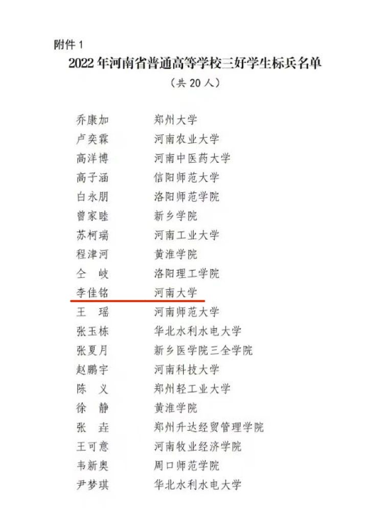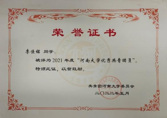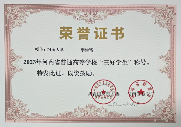 2023年,李佳铭荣获河南省普通高等学校三好学生标兵称号。
