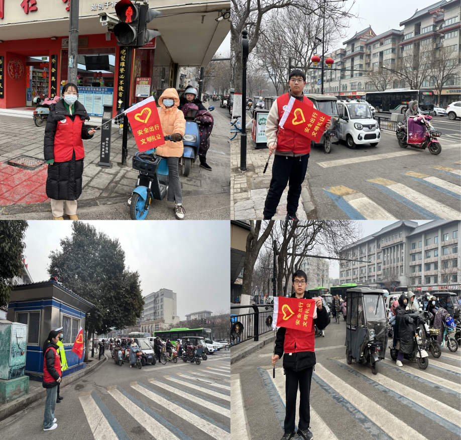 师生志愿者在开封市顺河回族区东司门岗开展文明交通指挥志愿服务活动。“你好,请在停止线内等候”、“骑电动自行车前请记住佩戴好头盔再出行。”活动现场,师生志愿者们化身文明交通劝导员,手持“安全出行 文明礼让”小红旗,引导行人、非机动车按照交通信号过马路,对行人逆向行驶、不礼让行人、骑摩托车不带头盔等不文明交通行为进行安全劝导,同时普及头盔的重要性,倡导过往群众“走文明路、行文明车、做文明人”,进一步传承弘扬雷锋精神,增强广大市民文明出行意识。