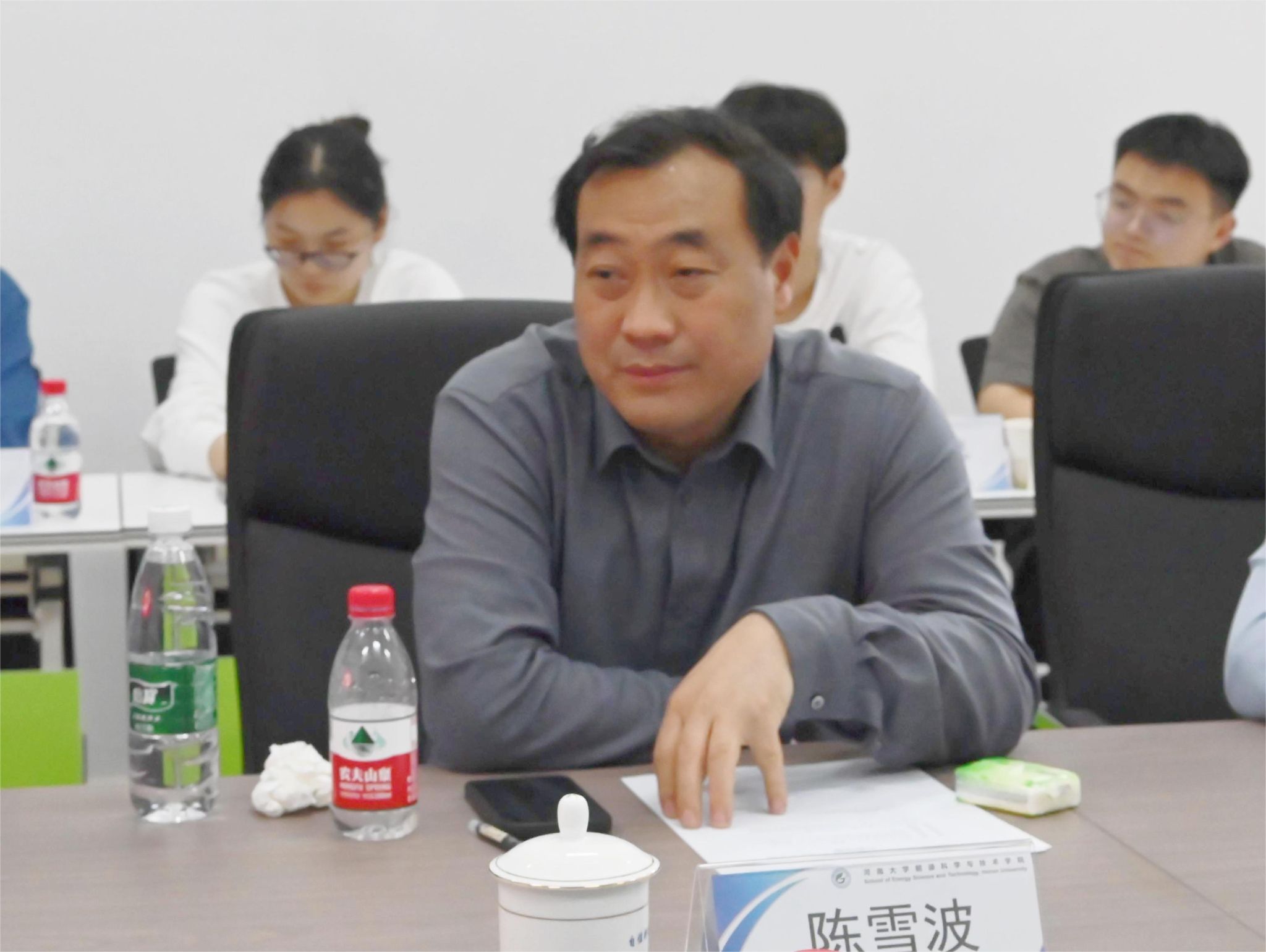 座谈会前,陈雪波参观了学院的办公和实验场地,详细了解楼层规划和学院建设进度。