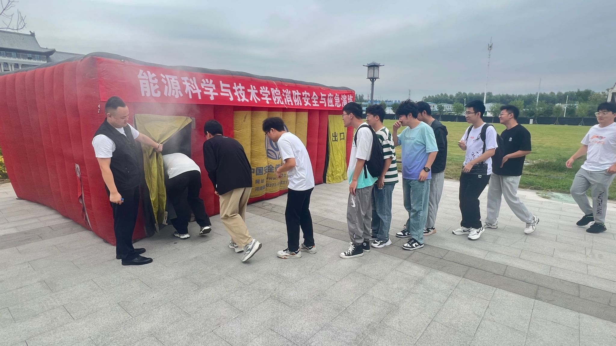 随后,紧张而逼真的消防逃生帐篷模拟演练拉开帷幕。逃生帐篷内模拟了火灾发生时的黑暗、烟雾弥漫的环境。师生们依次进入帐篷,在教官的指导下,用湿毛巾捂住口鼻,低姿弯腰,有序地寻找出口。通过亲身体验,大家更加深刻地认识到了在火灾中保持冷静、正确逃生的重要性。