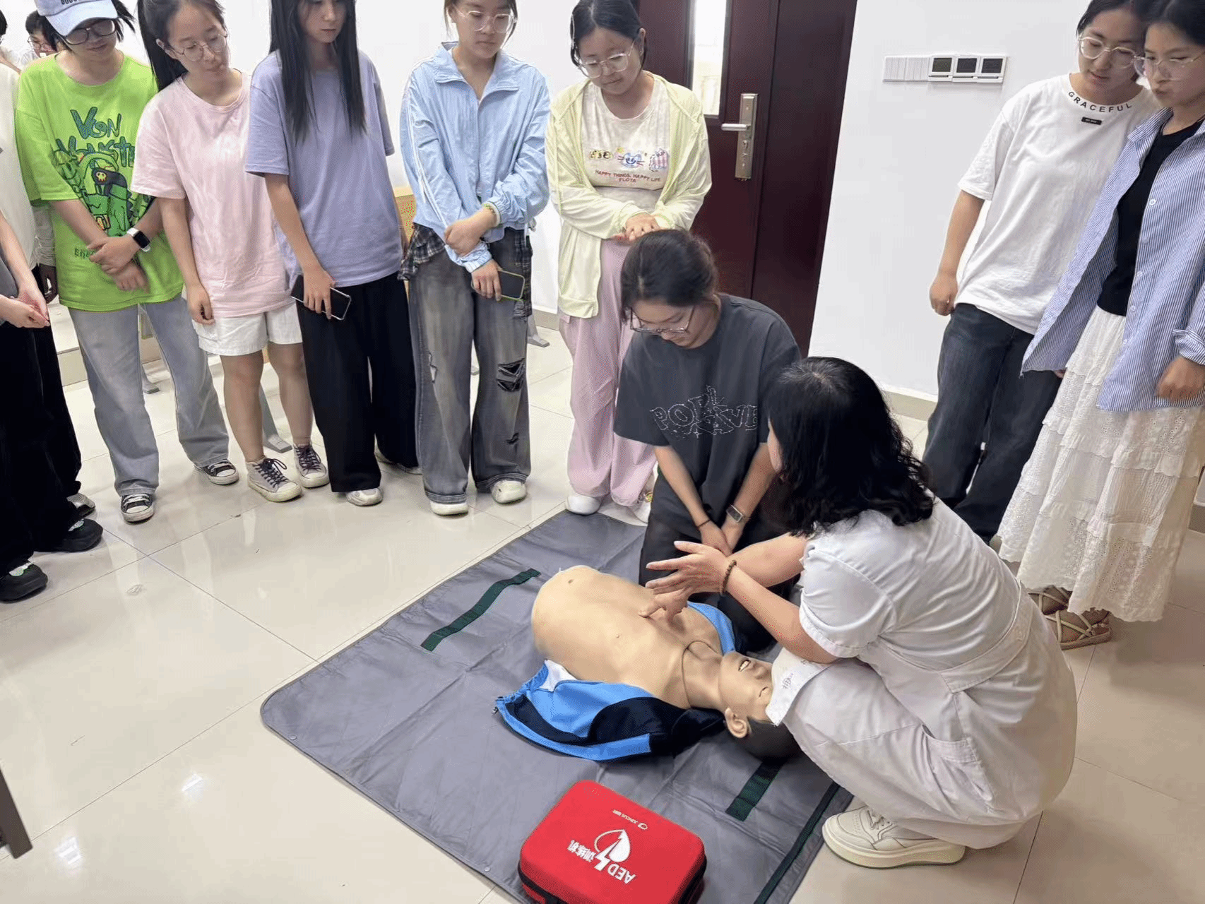 培训中,校医院老师通过理论讲解与实操演示相结合的方式,深入浅出地介绍了心肺复苏术的重要性、操作流程、动作要领以及AED(自动体外除颤器)的使用方法。同时,也普及了日常生活中常见意外伤害(如气道异物梗阻、外伤止血包扎等)的应急处理原则和技能。讲解内容科学严谨,语言通俗易懂,重点突出实用性。